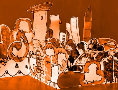 > Argibideak: Hasteko, moztu barazkiak nahi duzun aldetik, eta gero, margotu itzazu nahi duzun kolorez. Ondoren, inprimatu eraikinez eraikin, bata bestearen ondoan. Amaitutakoan, utzi pintura lehortzen, inprimatu dituzun eraikinen, zuhaitzen edo jendearen inguruak markatu baino lehen. Azaren inprimatzearekin egin erraldoiak, eta bihurtu artaburuaren markak etxe orratz, edo patatak, muino. Ondoren, moztu skyline edo zerumugaren inguruak, itsatsi elkarrekin, eta azkenean, tolestu aurrerantz eta atzerantz, skyline luzea bere buruari eusteko gai izan dadin.