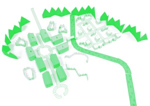 - Orain, etxe ertainen ordez, etxe handiak jarri behar dira; ez ahaztu zerbitzuetako eraikinak jartzeaz. Beste behin: zenbat familia bizi dira hor?