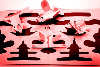 Our starting technique was the well known paper cut-out from folded A4 papers so you create symmetric forms. We used the original paper as a background for a photo project, but we didn’t want to throw away the cutouts, so we combined both into one collage. That is how the urban insect collection born.