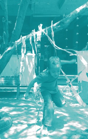 Para construir una cortina-penetrable, el papel y su tamaño se tornan pura materia. El papel se explora por su forma, color, plegado, sonido y olor. Con reglas de diferentes tamaños, se definió su tamaño. Con plumones se trazaron rayas para cortarlas y unirlas con pegamento. Líneas largas de papel se ubicaron en una rama baja de un árbol. Se hizo de éste, un espacio de juego para todos.