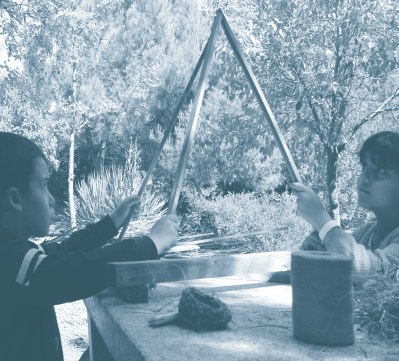 La maqueta. Hacer maquetas es una buena manera de pensar con las manos, introducimos así competencias manuales, manipulamos materiales, para esta fase conviene hacer pequeños grupos. Hemos puesto un ejemplo con una estructura base sencilla con forma del siempre estable tetraedro cubierto con la técnica de cestería libre. Eso nos permite utilizar los materiales naturales. Pero también funcionan bien las cajas de cereales pinchadas en los soportes verticales de servilleteros a modo de tronco de árbol o barro y pasta de modelar. Un punto de abstracción nunca está de más en la elaboración de las maquetas enriqueciendo así el proceso creativo que se está proponiendo.